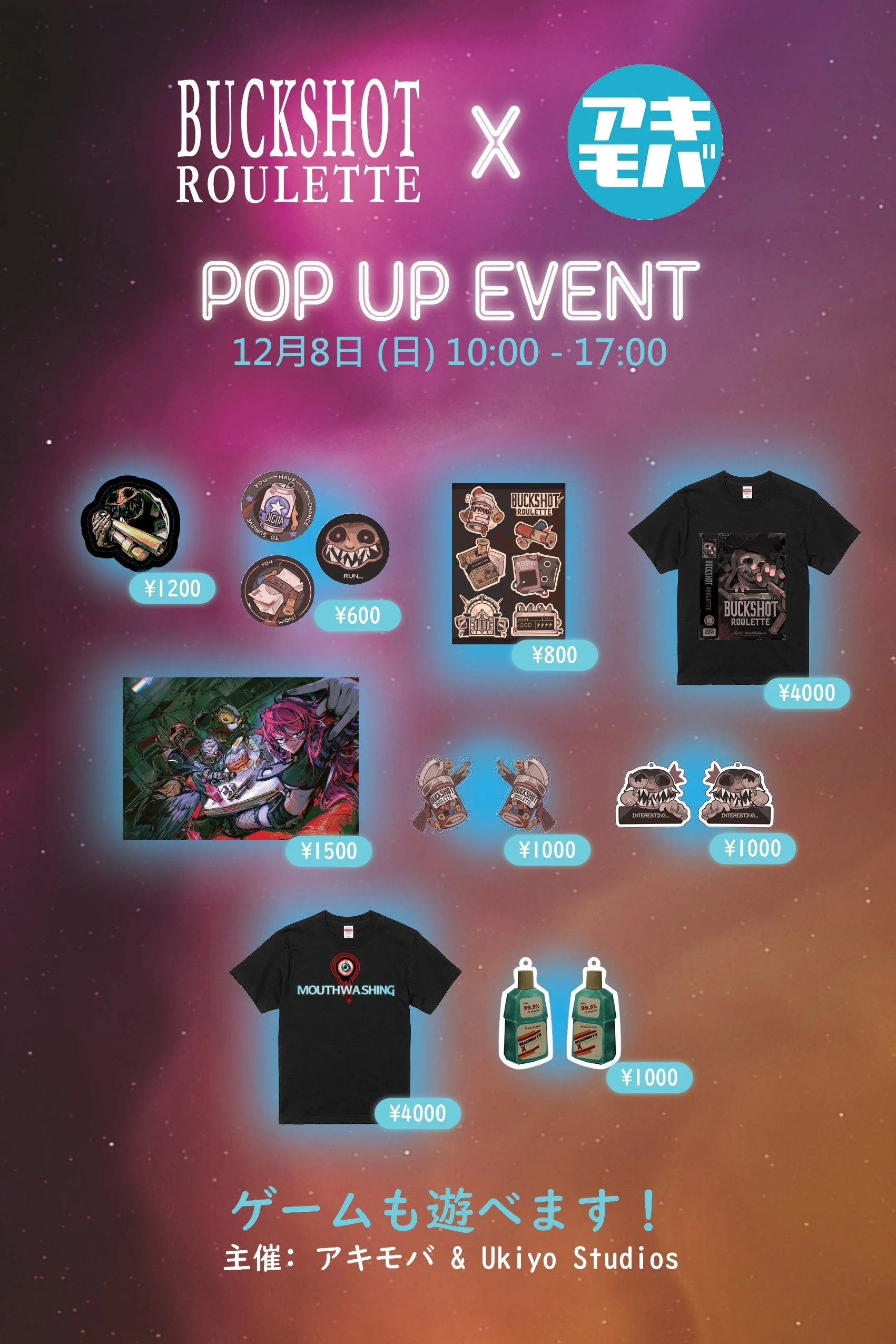 2024年11月29日 Ukiyo Studiosとアキモバは、ゲームパブリッシャーCritical Reflex社と共に2024年12月8日に、東京・秋葉原のアキモバにて、「Buckshot Roulette」と「Mouthwashing」をテーマとしたPOPUPイベントを開催いたします。本イベントでは、「Buckshot Roulette」の4人対戦マルチプレイヤーモードと「Mouthwashing」の試遊ができ、さらに限定グッズも購入することができます。